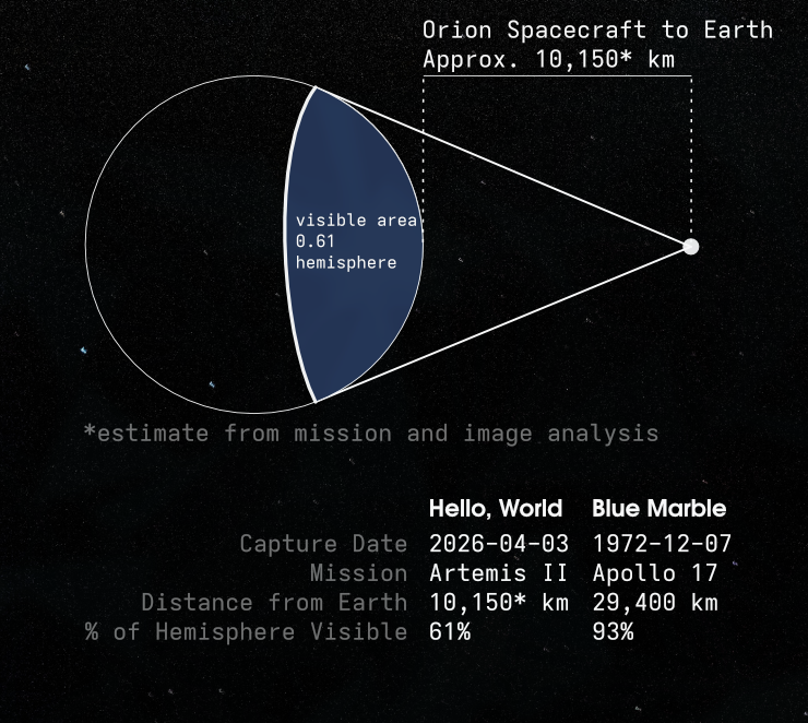 NASA’s Blue Marble photograph from Apollo 17 is the closest analog to the Hello, World photo. The Blue Marble was photographed from nearly 3 times the distance from Earth. The infographic includes a detailed comparison table for those who would like to nerd out.